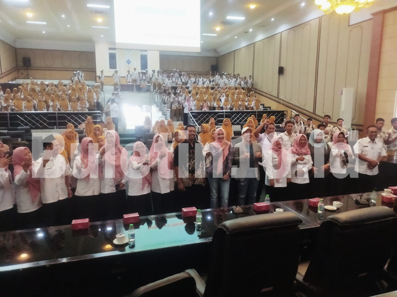 Sejak datang secara berombongan menumpang sejumlah Bus Tayo, ratusan siswa SMPN 2 Kesamben tampak bersemangat saat menginjakkan kaki di gedung wakil rakyat. Mereka disambut langsung Sekretaris DPRD Jombang, Bambang Sriyadi dan sejumlah anggota dewan yang dipimpin langsung oleh Ketua Komisi D Erna Kuswati.