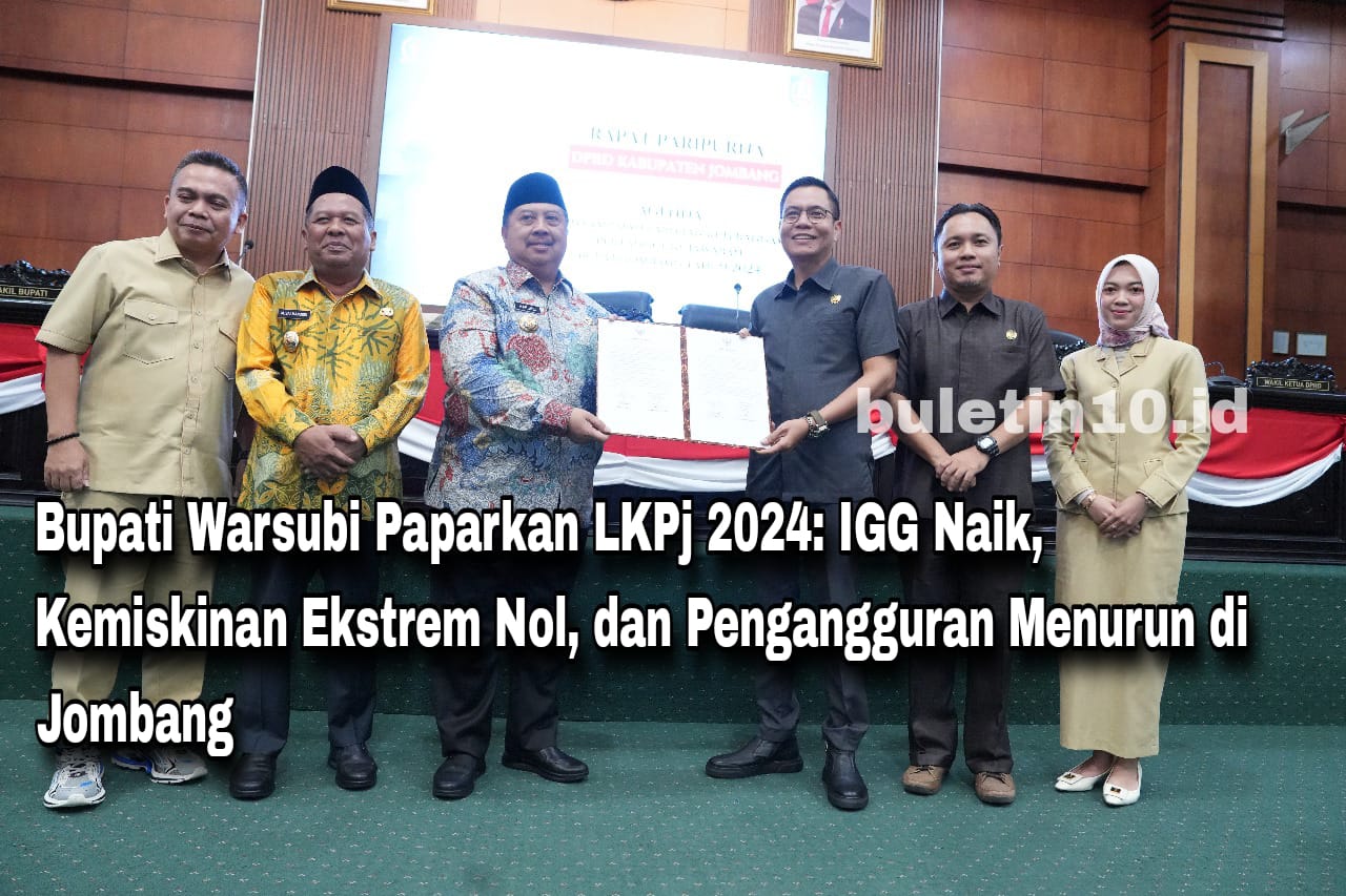 buletin10.id – Jombang – Bupati Warsubi bersama dengan Wakil Bupati Salmanudin Yazid memaparkan Laporan Keterangan Pertanggungjawaban (LKPj) 2024 kepada DPRD Jombang Kamis malam (20/03/2025). Selain menyampaikan pertanggungjawaban penggunaan anggaran, Bupati Warsubi juga menyampakan sejumlah keberhasilan pencapaian program pembangunan dalam forum rapat paripurna DPRD Jombang.