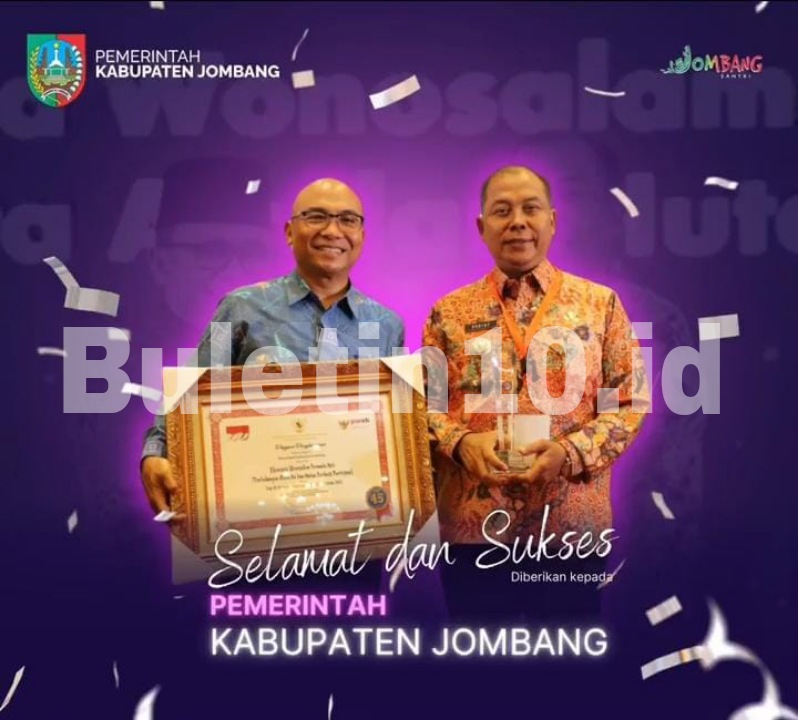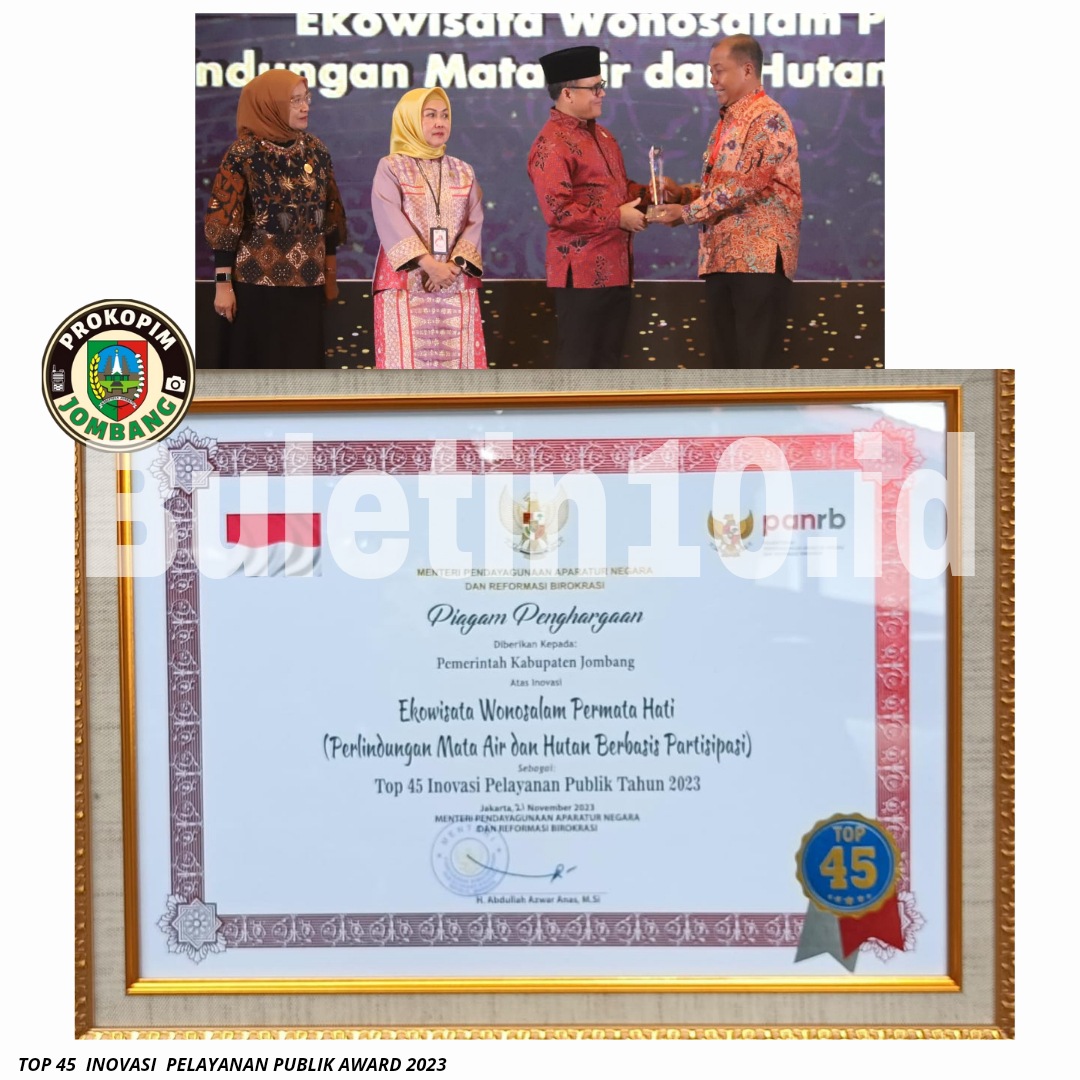 Buletin10.id – Jombang – Pemkab Jombang untuk pertama kalinya berhasil mendapatkan apresiasi dan sekaligus penghargaan bergengsi tingkat nasional. Yakni sebagai Top 45 Inovasi Pelayanan Publik Tahun 2023 untuk Ekowisata Wonosalam Permata Hati (Perlindungan Mata Air dan Hutan Berbasis Partisipasi) dari Kementerian Pendayagunaan Aparatur Negara dan Reformasi Birokrasi (PAN-RB), yang diserahkan langsung oleh Menteri PAN-RB Abdullah Azwar Anas kepada Pj Bupati Jombang Sugiat, pada acara Kompetisi Inovasi Pelayanan Publik (KIPP) Tahun 2023, yang dirangkai dengan peresmian Bersama 12 Mall Pelayanan Publik dan peluncuran platform Jaringan Inovasi Pelayanan Publik Nasional (JIPPNas) pada, Selasa, (21/11/2023), siang di Jakarta.