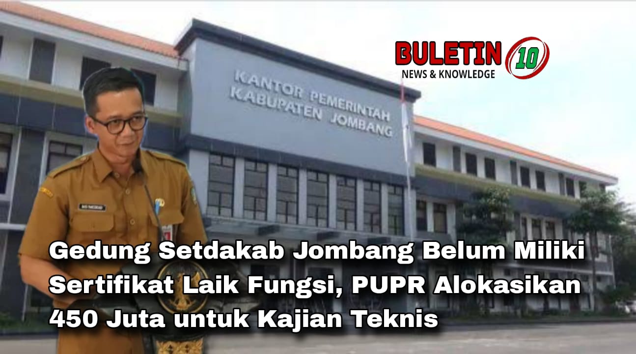 buletin10.id – Jombang – Hingga saat ini ternyata kompleks gedung Sekretariat Daerah Kabupatan (Setdakab) Jombang belum memiliki Sertifikat Laik Fungsi (SLF). Oleh sebab itu, Pemkab Jombang melalui Dinas Pekerjaan Umum dan Penataan Ruang (PUPR) setempat pada tahun 2025 ini telah mengalokasikan anggaran sebesar Rp 450 juta lebih untuk melakukan kajian teknis SLF di gedung berumur puluhan tahun tersebut.