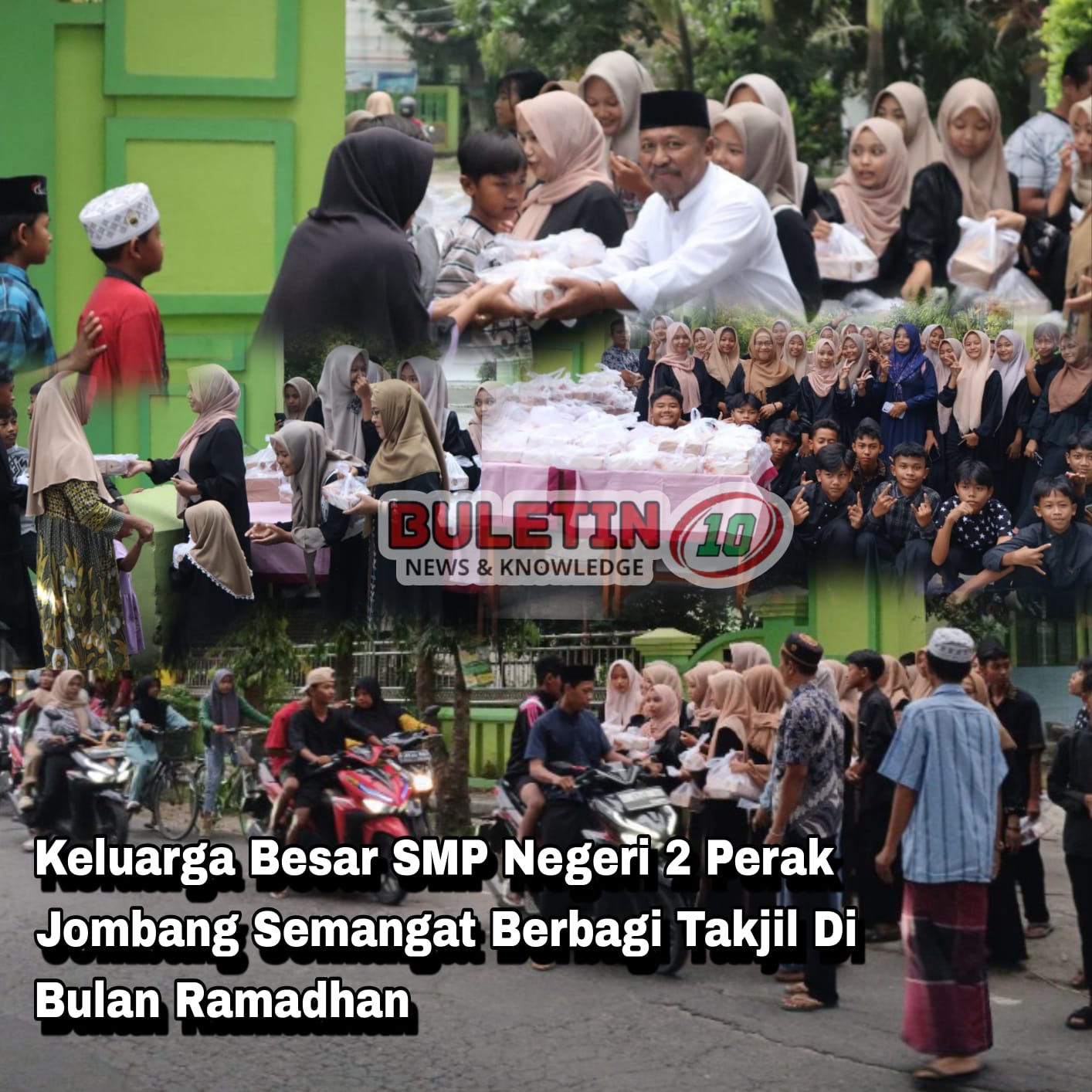 Kegiatan berbagi takjil di bulan Ramadhan telah menjadi agenda rutin tahunan yang selalu dilaksanakan pihak SMP Negeri 2 Perak Jombang. Dan kali ini, sekolah yang berlokasi di Desa Cangkringrandu Kecamatan Perak Jombang telah menyiapkan ratusan porsi takjil yang akan dibagikan kepada masyarakat sekitar sekolah dan para pengguna jalan.