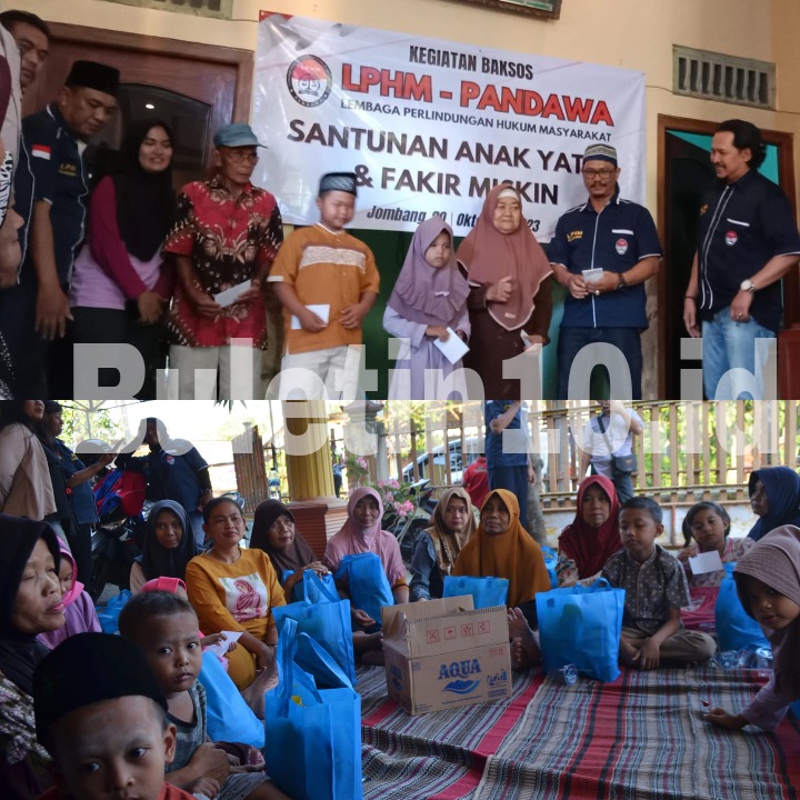 Buletin10.id – Jombang – Lembaga Perlindungan Hukum Masyarakat (LPHM) Pandawa Kabupaten Jombang, Jumat, (20/10/2023), sore, menggelar kegiatan bhakti sosial bagi kaum termarjinal. Yakni anak-anak yatim dan fakir miskin di kawasan Kecamatan Ploso Jombang. Adapun lokasi pembagian di kantor pusat LPHM Pandawa Jl. Joyolengkoro RT/RW.05/02, Desa/ Kecamatan Ploso, Jombang.