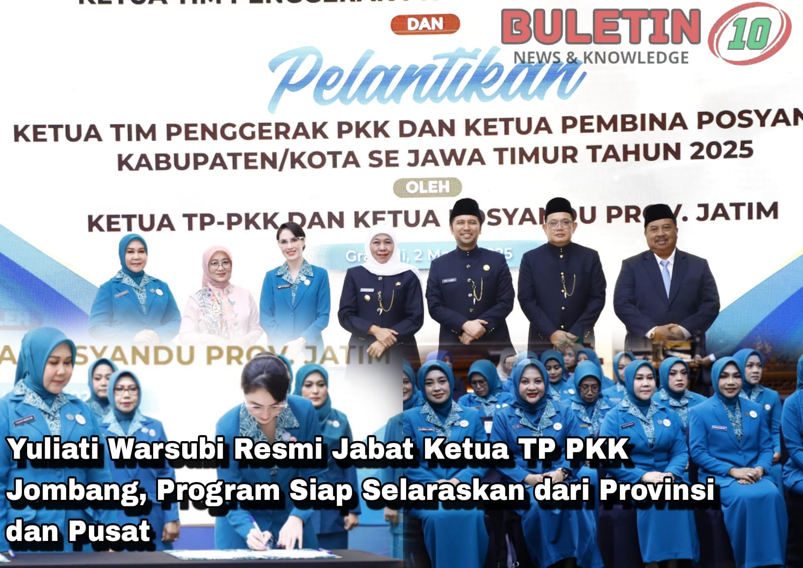 buletin10.id – Jombang – Yuliati Nugrahani Warsubi resmi dilantik menjadi Ketua Tim Penggerak (TP) PKK Kabupaten Jombang sekaligus Ketua Pembina Posyandu Kabupaten Jombang periode 2025-2030 bersama dengan Ketua TP PKK kabupaten/kota se Jawa Timur di Gedung Grahadi, Surabaya, Minggu (02/03/2025). Pelantikan dilakukan oleh Ketua TP PKK Jawa Timur, Arumi Bachsin.